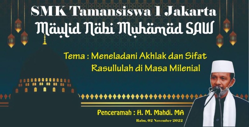 Rabu, 2 November 2022 SMK Tamansiswa 1 Jakarta mengadakan acara memperingati Maulid Nabi Muhammad SAW 1444 H dengan dihadiri oleh Ustd. H. M. Mahdi MA sebagai penceramah. Kegiatan ini juga dihadiri oleh perwakilan pengurus Yayasan Perguruan Tamansiswa cabang Jakarta, Kepala Sekolah, Manajemen Sekolah dan para Pamong Pengajar. Dengan jumlah peserta sekitar 700 peserta didik kegiatan Maulid Nabi Muhammad SAW ini berjalan dengan tertib.